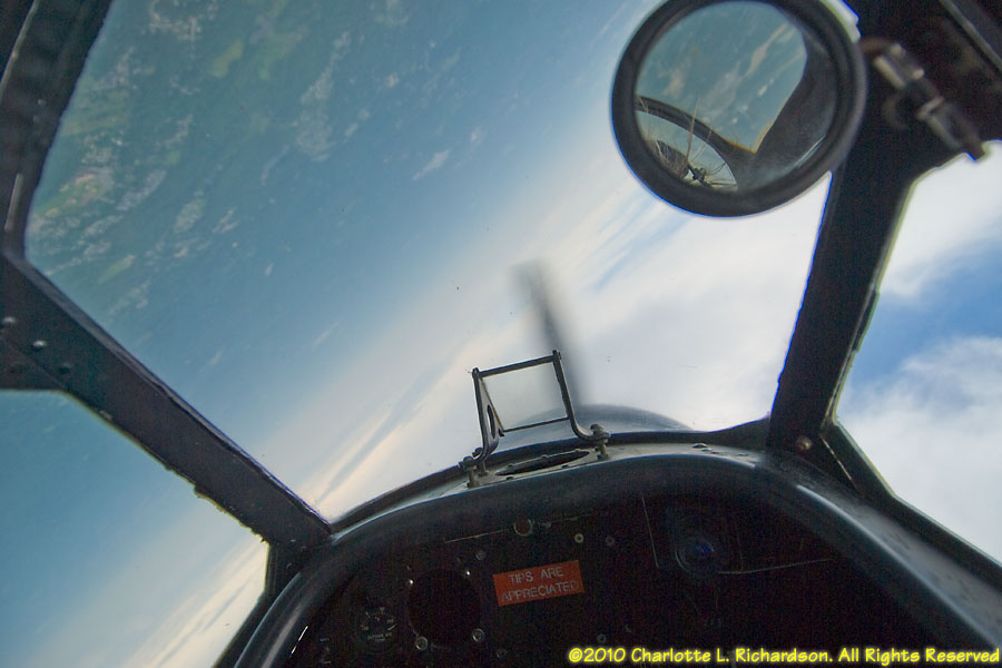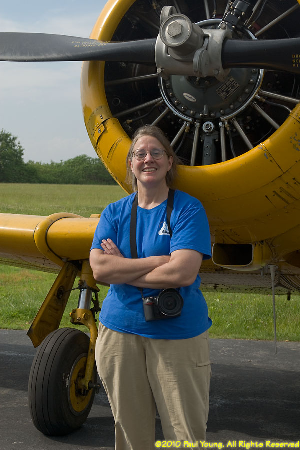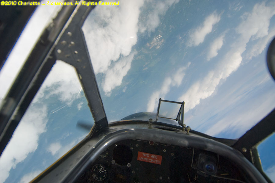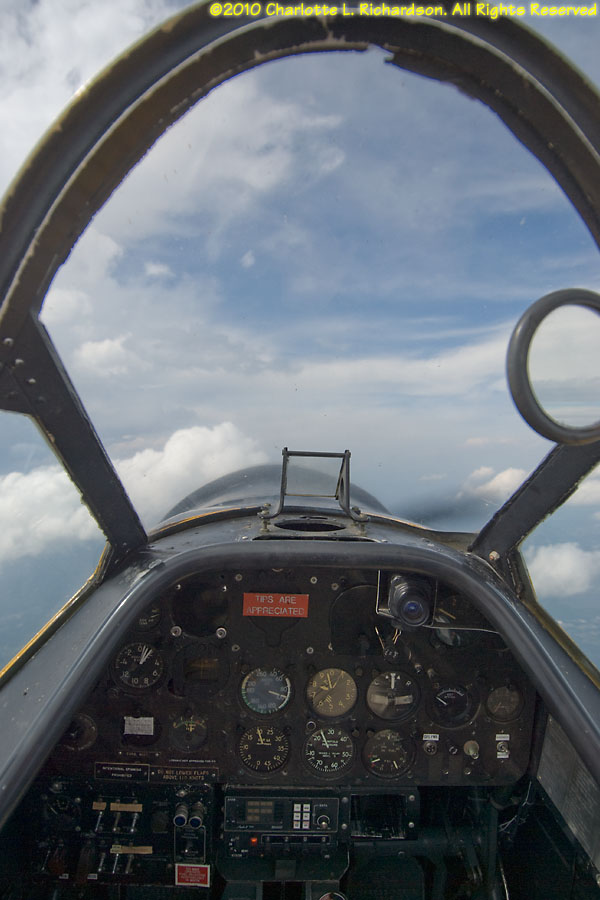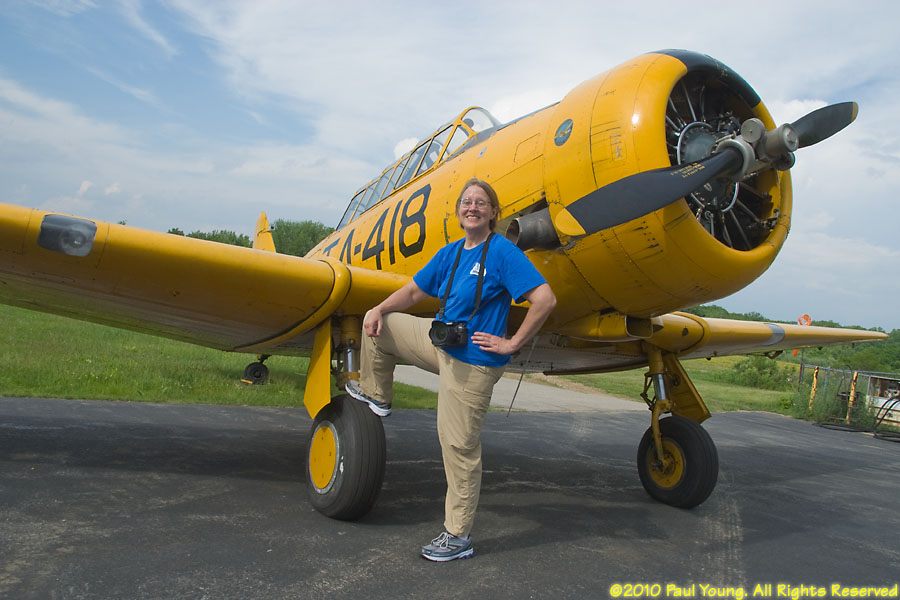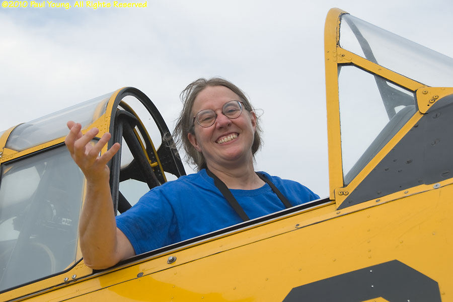 5 June 2010: The best birthday present Charlotte ever got: an hour-long aerobatic flight in a T-6G Texan, a World War II fighter trainer plane built in 1945, with North American Top-Gun (sadly, they seem to no longer exist, and their web site is gone). She shot a D200 with the 12-24 F4 in a body harness, and, when done shooting, she flew the Texan herself.
