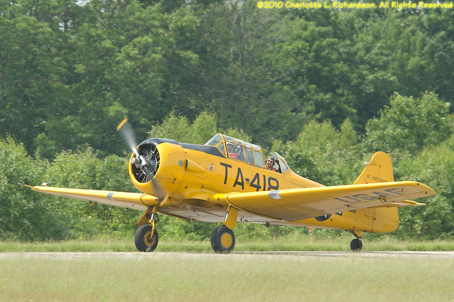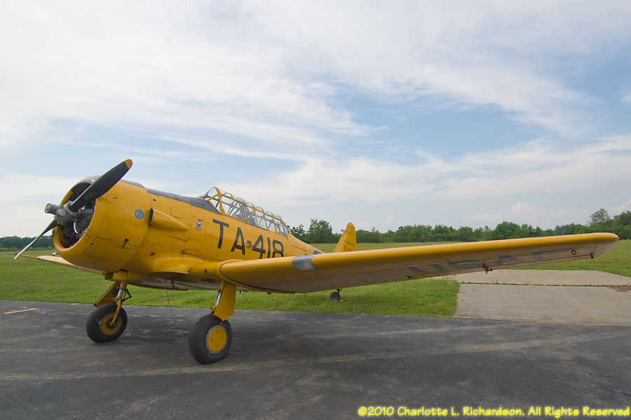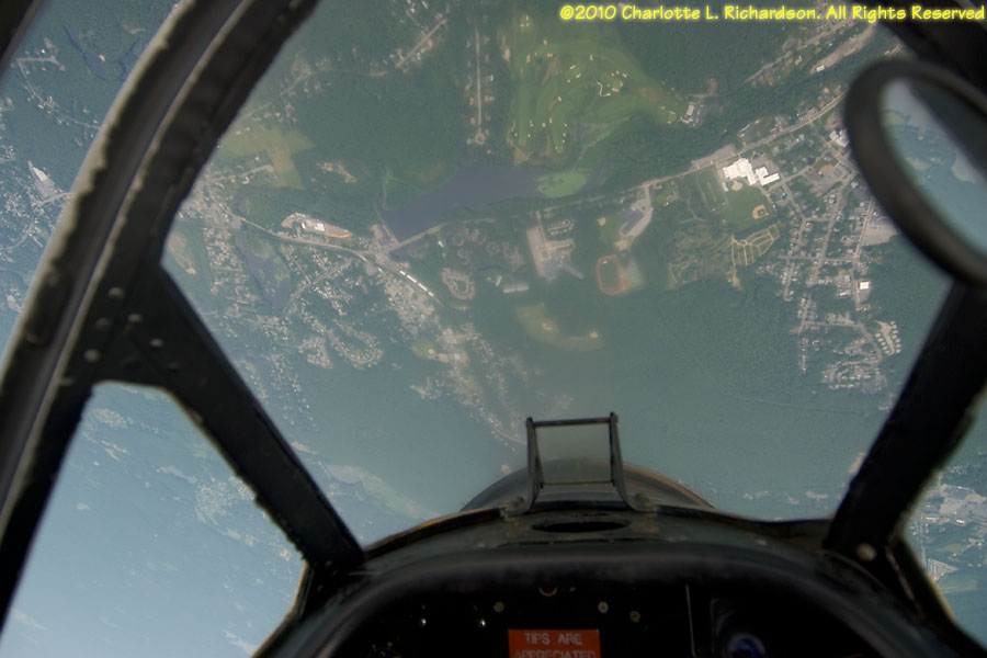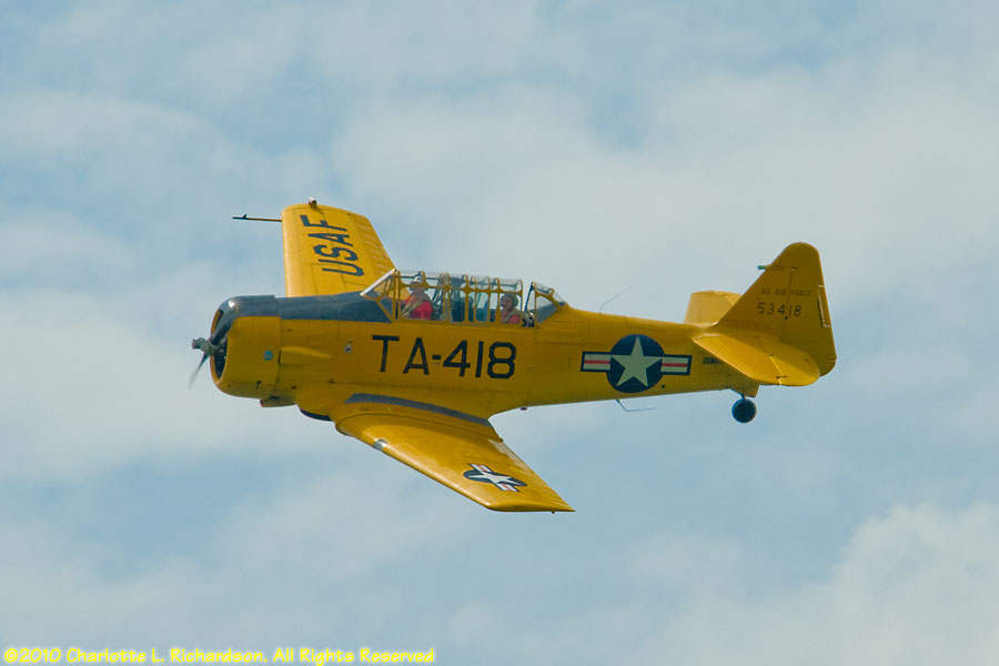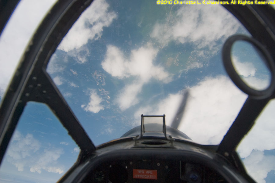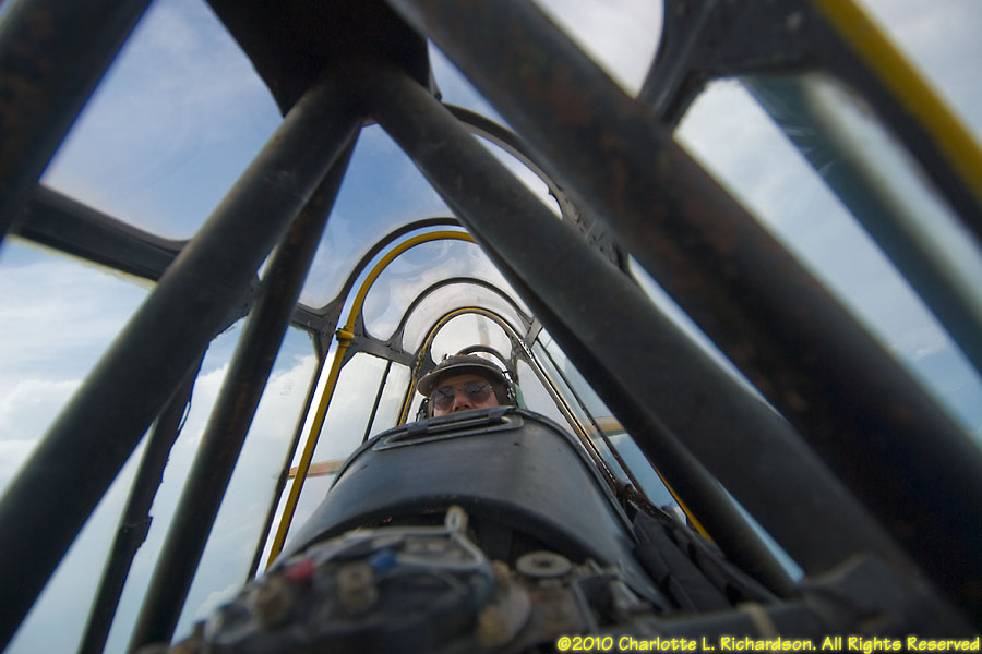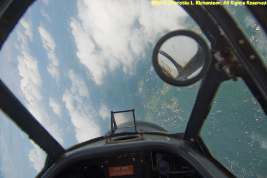 5 June 2010: The best birthday present Charlotte ever got: an hour-long aerobatic flight in a T-6G Texan, a World War II fighter trainer plane built in 1945, with North American Top-Gun (sadly, they seem to no longer exist, and their web site is gone). She shot a D200 with the 12-24 F4 in a body harness, and, when done shooting, she flew the Texan herself.