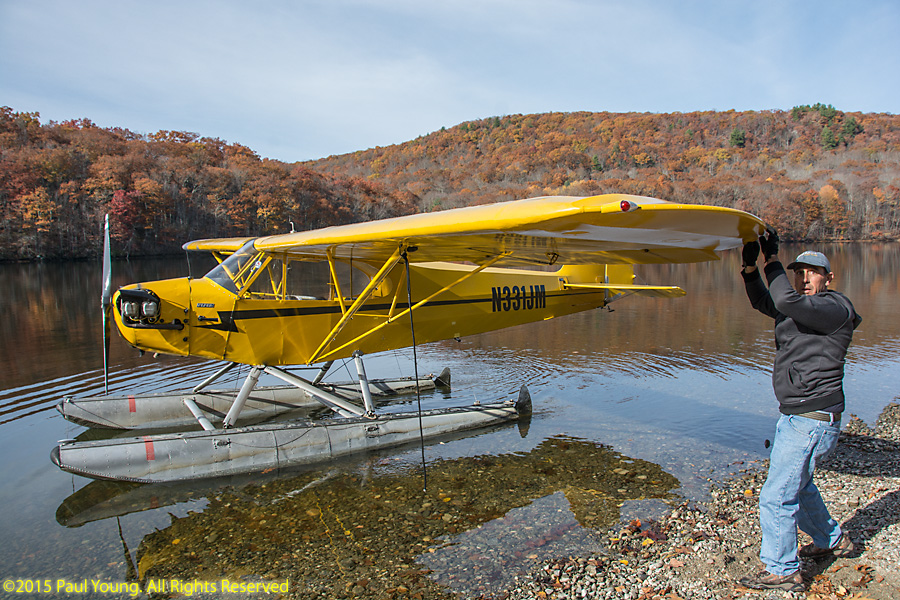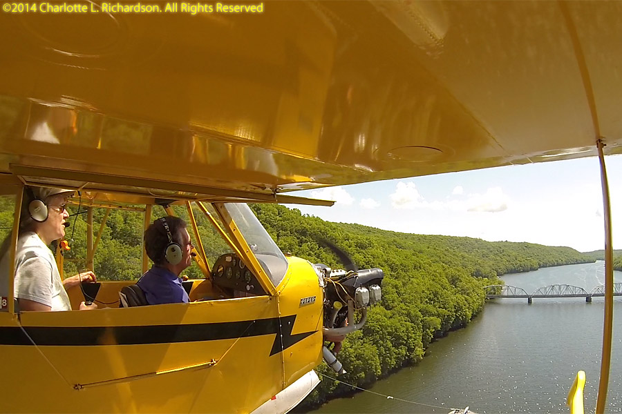 Another visit to fly this Cub with Tony, October 13, 2014. The cowling has been fixed to match the new exhaust system. We mounted the GoPro on the right wing strut. This flight was almost entirely glassy water takeoffs and landings. I step-taxiied under the I84 bridge at one point, taking off again just beyond it.
