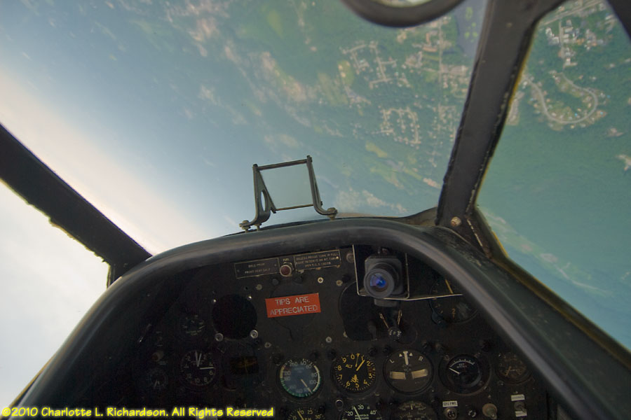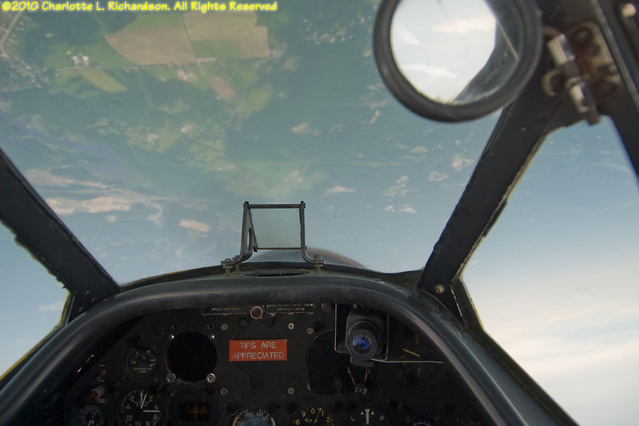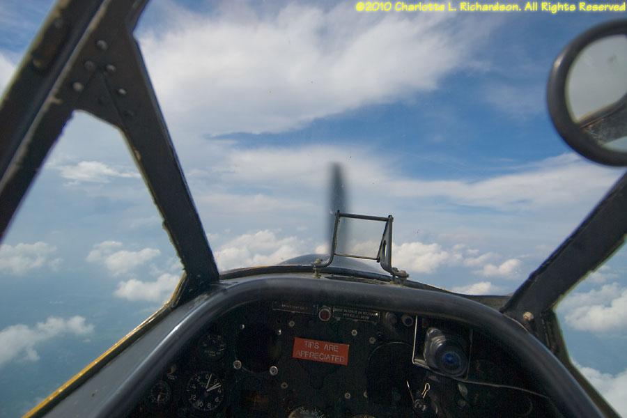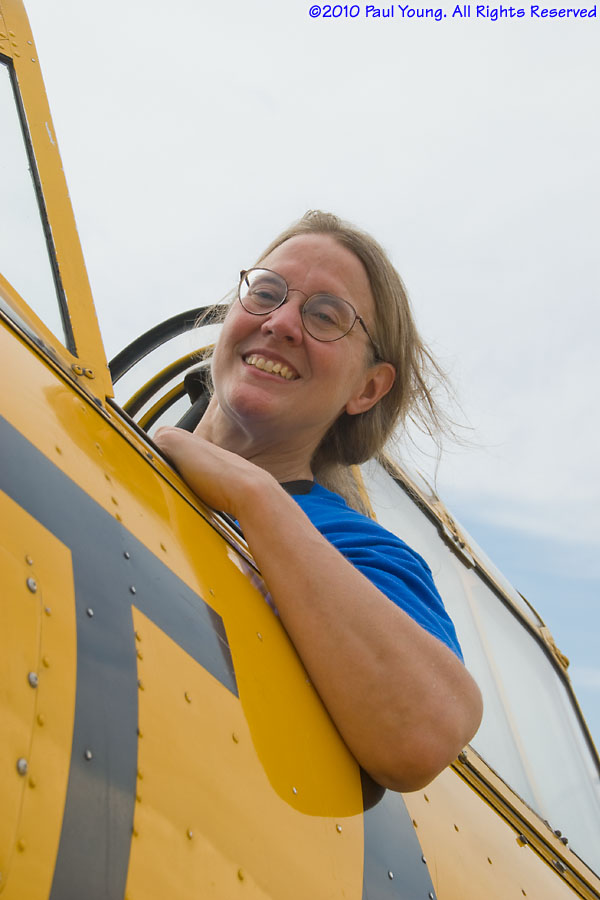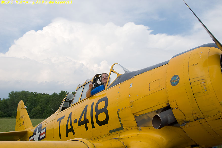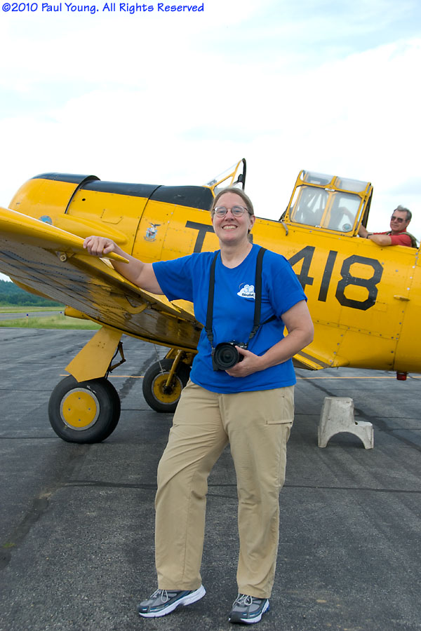 5 June 2010: The best birthday present Charlotte ever got: an hour-long aerobatic flight in a T-6G Texan, a World War II fighter trainer plane built in 1945, with North American Top-Gun (sadly, they seem to no longer exist, and their web site is gone). She shot a D200 with the 12-24 F4 in a body harness, and, when done shooting, she flew the Texan herself.
