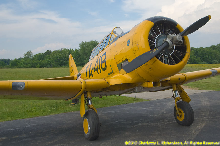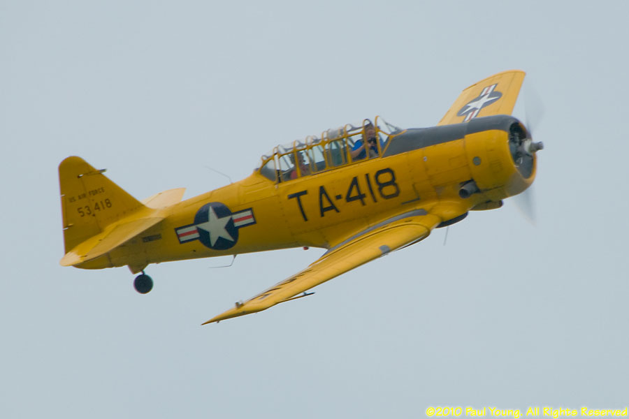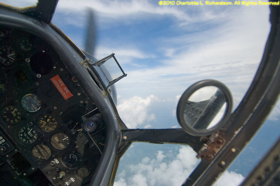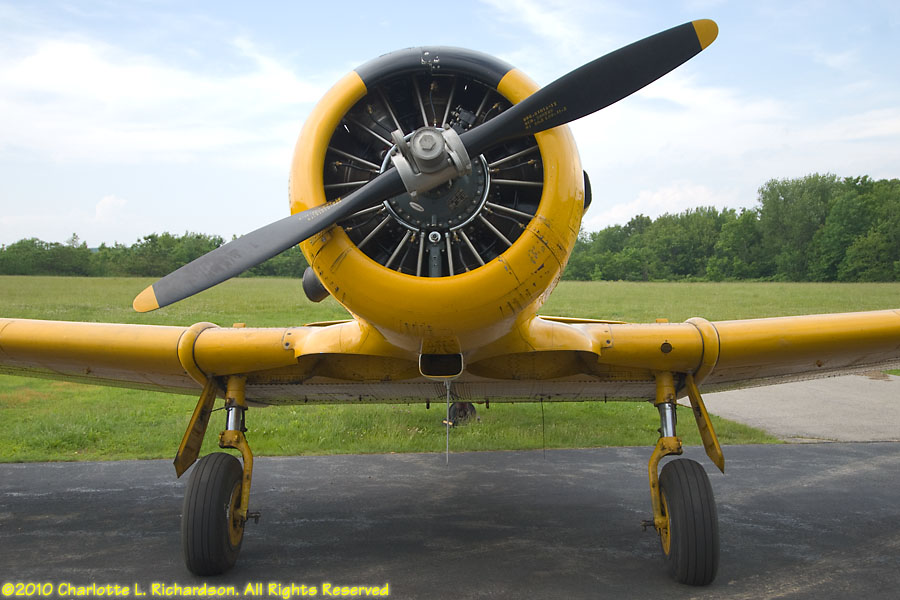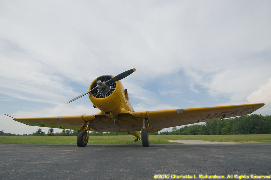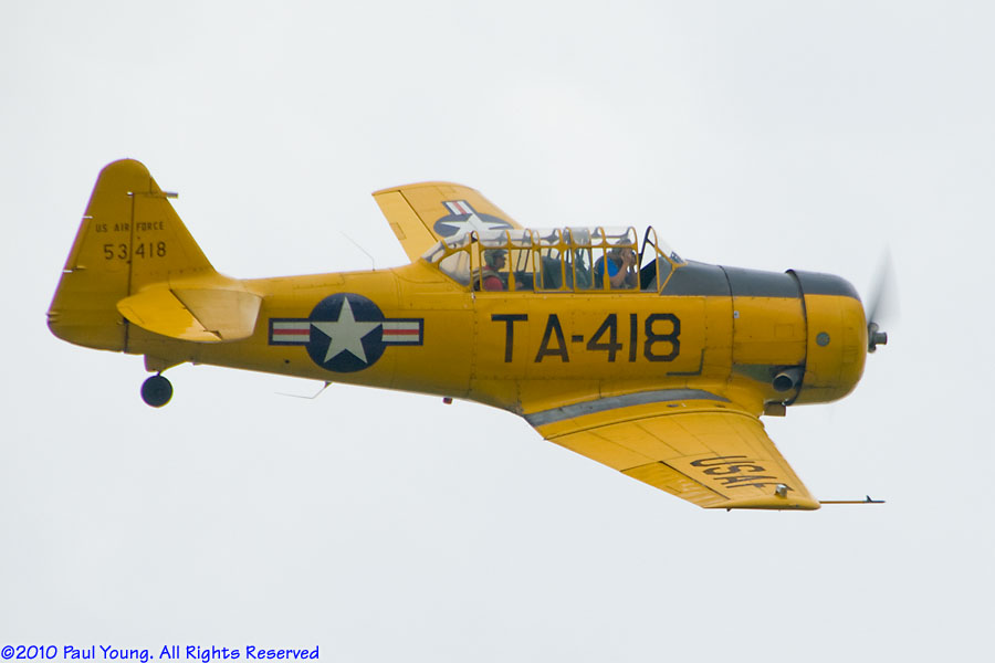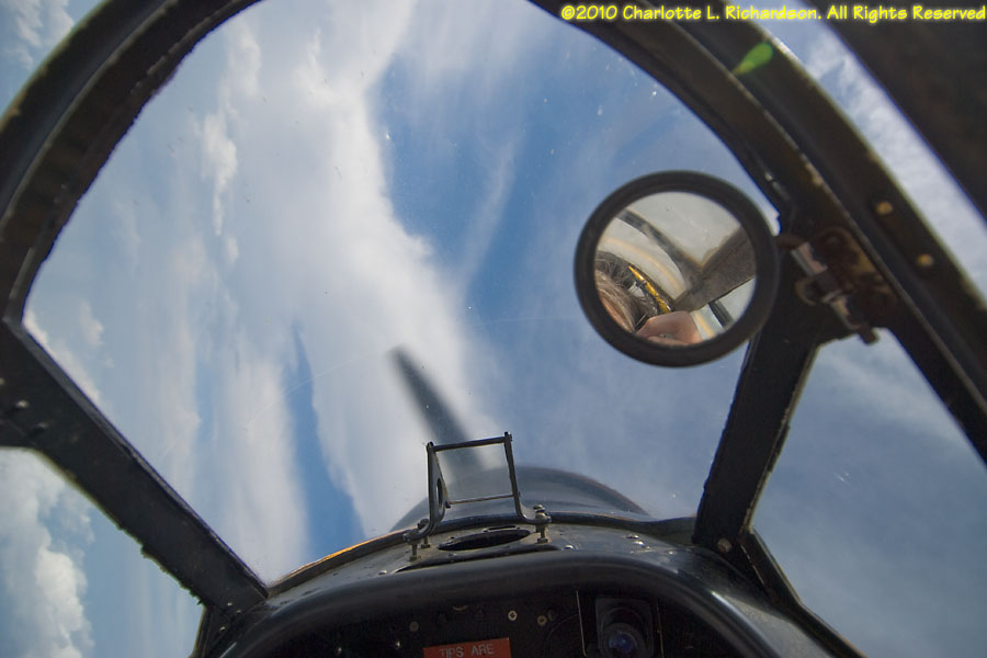 5 June 2010: The best birthday present Charlotte ever got: an hour-long aerobatic flight in a T-6G Texan, a World War II fighter trainer plane built in 1945, with North American Top-Gun (sadly, they seem to no longer exist, and their web site is gone). She shot a D200 with the 12-24 F4 in a body harness, and, when done shooting, she flew the Texan herself.