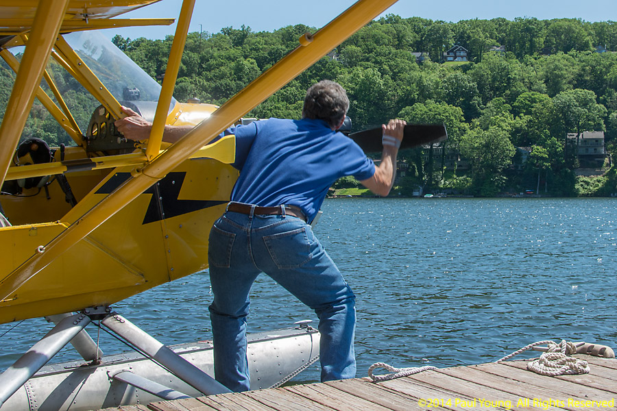 We returned on June 7, 2014. The Cub's new engine has a different exhaust system, so the cowling doesn't fit, but it seems fine without it. We mounted the GoPro on the strut of the right wing. Rob hand-props the Cub.